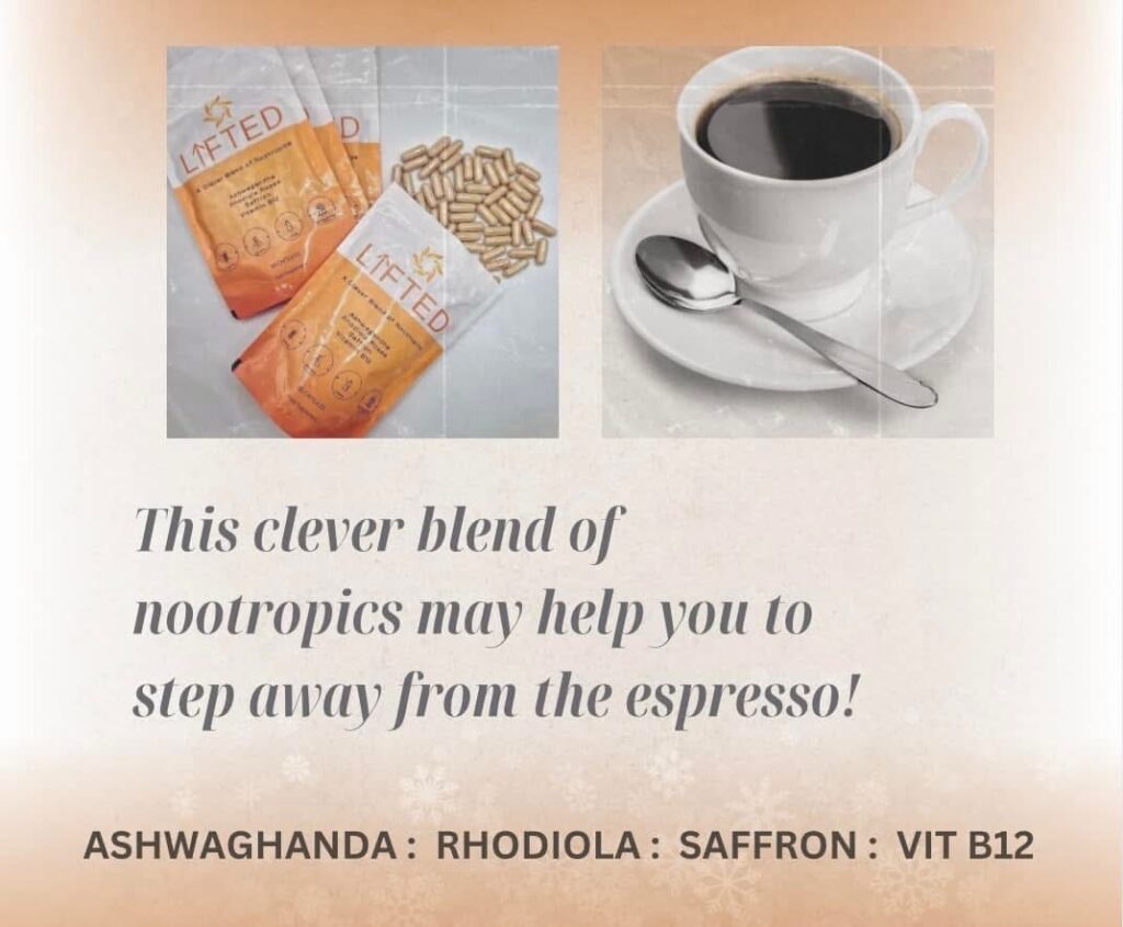 Embrace the natural benefits of “Lifted,” a unique blend of nootropics designed for women seeking mental clarity and PMS relief. This powerful formula combines Ashwagandha, Rhodiola Rosea, Saffron, and Vitamin B12 to support relaxation, boost mental energy, and enhance mood. Perfect for those looking to manage stress and fatigue, “Lifted” is your go-to for a balanced and vibrant wellbeing. Elevate your daily wellness routine with “Lifted” and experience the transformative effects on your mental and physical health. Click the image below!